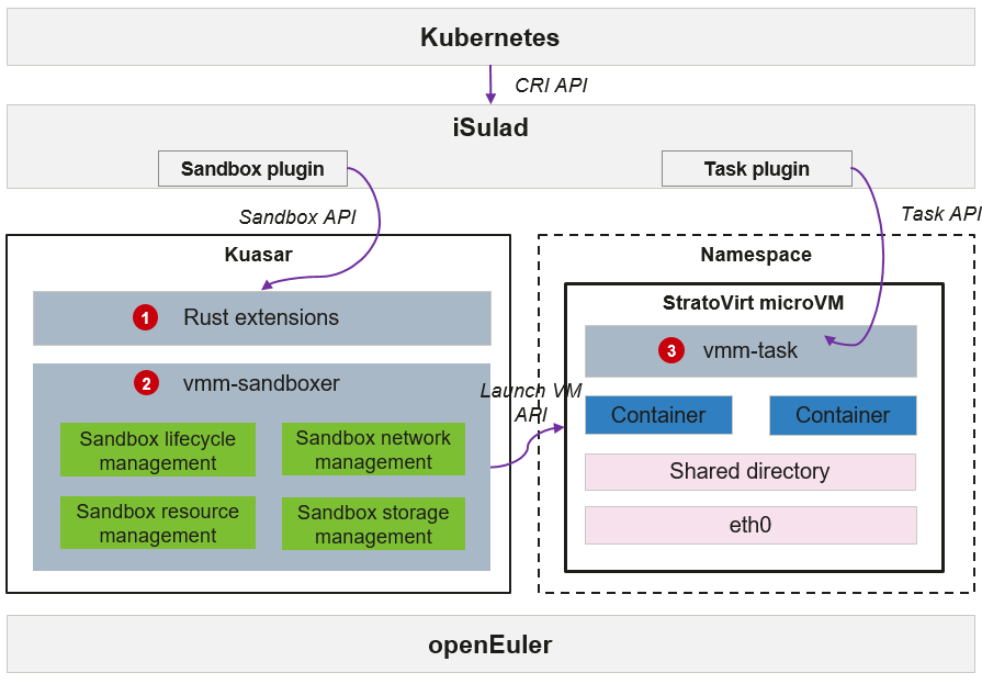 Kuasar is a container runtime that supports unified management of multiple types of sandboxes. It supports multiple mainstream sandbox isolation technologies, including the kernel-based native container sandbox, lightweight virtualization technology-based microVM sandbox, application kernel sandbox based on process-level virtualization, and the emerging WebAssembly sandbox. Based on the Kuasar unified container runtime combined with the iSulad container engine and StratoVirt virtualization engine, openEuler builds lightweight full-stack self-developed secure containers for cloud native scenarios, delivering key competitiveness of ultra-low overhead and ultra-fast startup.