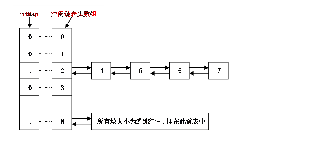 For example, the sizes of idle blocks that can be mounted to the linked list whose index is 2 are 4, 5, 6, and 7, and the sizes of idle blocks that can be mounted to the linked list whose index is N are 2^N to 2^(N+1)-1.