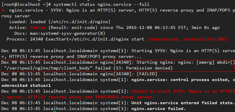 As shown in Figure 2, the Nginx service fails to be created because the /var/spool/nginx/tmp/client_body directory fails to be created. You need to manually create the directory as the root user. Solve similar problems as follows:
