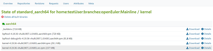 osc getbinaries home:testUser:branches:openEuler:Mainline my-first-obs-package standard_aarch64 aarch64The parameters in the command are described as follows. You can modify the parameters according to the actual situation.