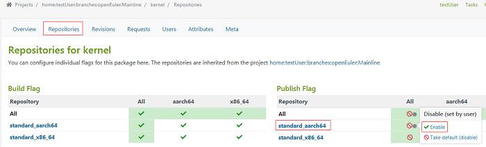 Click the Repositories tab. On the software repository management page that is displayed, click Enable in Publish Flag to enable the RPM software package download function (the status changes from to ), as shown in Figure 7.