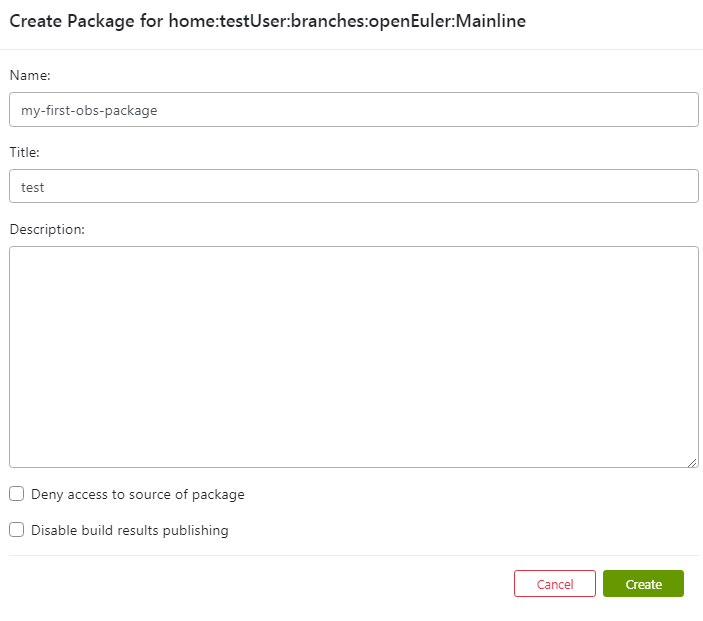 shellcd home:testUser:branches:openEuler:Mainline osc rm zlib osc commit -m "commit log"Create a software package in your own project. For example, to add the my-first-obs-package software package, run the following command: