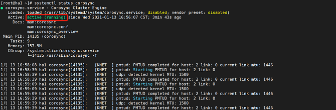 shellsystemctl status corosyncThe service is started successfully if the following information is displayed: