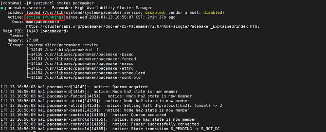 shellsystemctl status pacemakerThe service is started successfully if the following information is displayed: