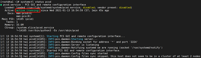 shellsystemctl status pcsdThe service is started successfully if the following information is displayed: