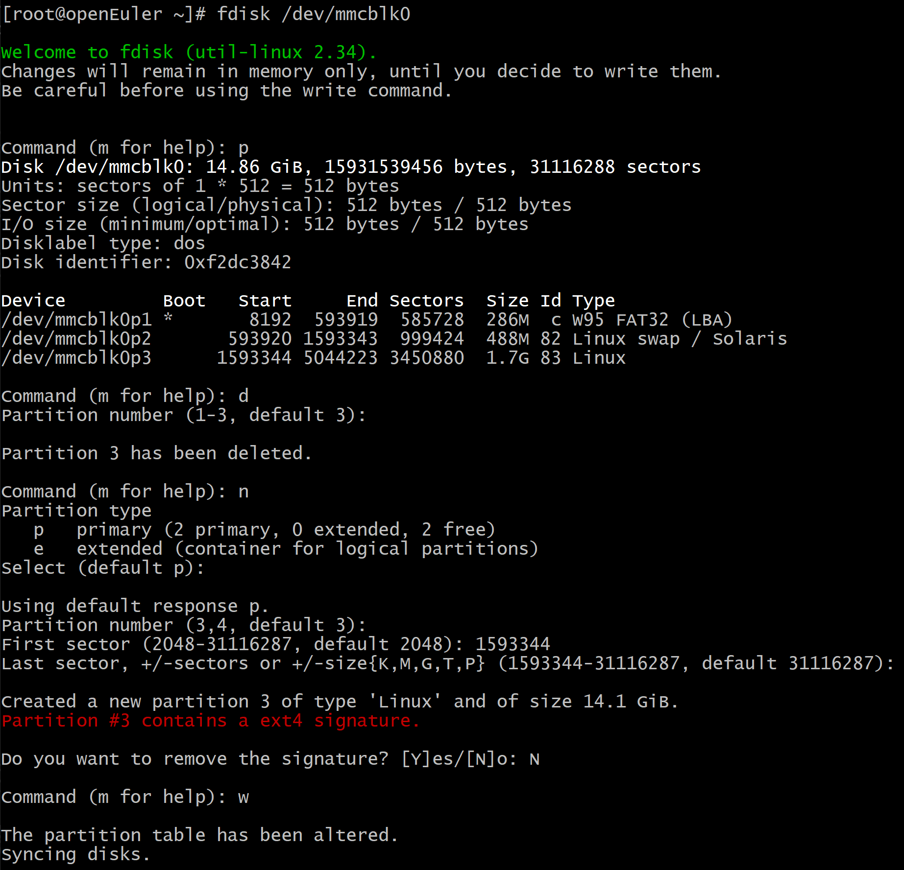 3or pressEnterto create a partition whose number is3. That is, the/dev/mmcblk0p3.Enter the start sector number of the new partition. That is, the start sector number recorded in Step