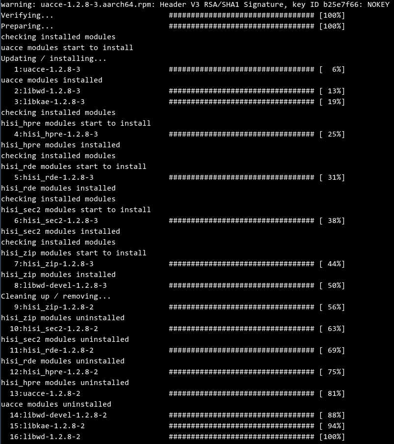 shellrpm -ivh uacce*.rpm hisi*.rpm libwd-*.rpm libkae*.rpmtextVerifying... ################################# [100%] Preparing... ################################# [100%] checking installed modules uacce modules start to install Updating / installing... 1:uacce-1.2.10-4.oe1 ################################# [ 14%] uacce modules installed 2:libwd-1.2.10-3.oe1 ################################# [ 29%] 3:libkae-1.2.10-3.oe1 ################################# [ 43%] checking installed modules hisi_hpre modules start to install 4:hisi_hpre-1.2.10-4.oe1 ################################# [ 57%] hisi_hpre modules installed checking installed modules hisi_rde modules start to install 5:hisi_rde-1.2.10-4.oe1 ################################# [ 71%] hisi_rde modules installed checking installed modules hisi_sec2 modules start to install 6:hisi_sec2-1.2.10-4.oe1 ################################# [ 86%] hisi_sec2 modules installed checking installed modules hisi_zip modules start to install 7:hisi_zip-1.2.10-4.oe1 ################################# [100%] hisi_zip modules installedRun the rpm -qa command to check whether the accelerator software packages have been installed successfully. Run the rpm -ql command to check whether files in the software packages are correct. The following is an example: