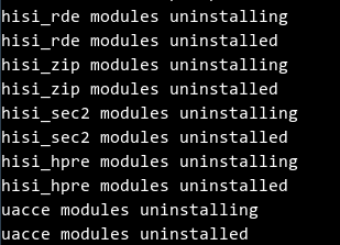 shell# lsmod | grep uacce uacce 36864 3 hisi_sec2,hisi_qm,hisi_hpre # rmmod hisi_hpre # rmmod hisi_sec2 # rmmod hisi_qm # rmmod uacce # lsmod | grep uacce #Run the rpm -e command to uninstall the accelerator engine software packages. The following is an example: