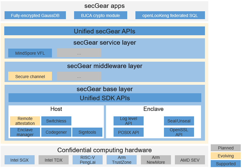 The architecture of secGear consists of three layers that form the foundation of openEuler confidential computing software.