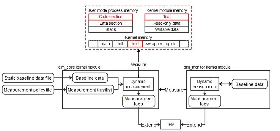 | dim | dim_core | Kernel module for executing the core dynamic measurement logic, including policy parsing, static baseline parsing, dynamic baseline establishment, measurement execution, measurement logging, and TPM extension operations, to measure key memory data. |