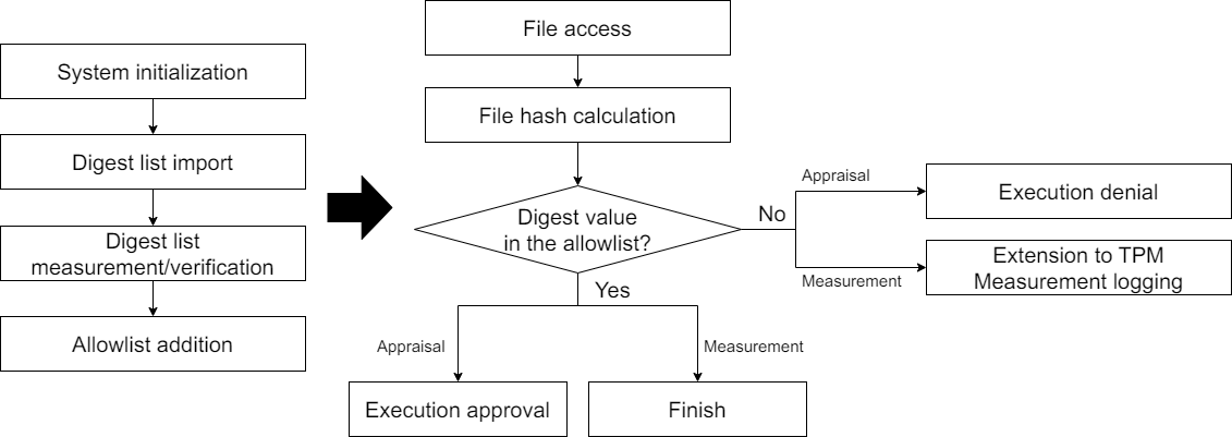 When an application is executed, IMA measurement is triggered. If the file digest matches the allowlist, it is ignored. Otherwise, the measurement log is recorded (synchronously extended to the TPM).