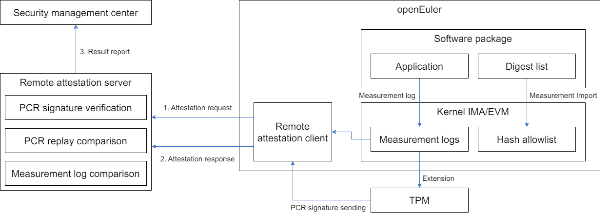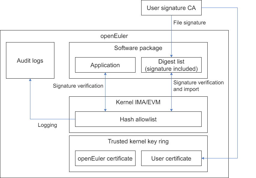 - Security: IMA digest lists are distributed with software packages. During installation, digest lists are imported simultaneously, ensuring baseline values originate from the software distributor (like the openEuler community). This eliminates the need to generate baseline values in the runtime environment, establishing a complete trust chain.