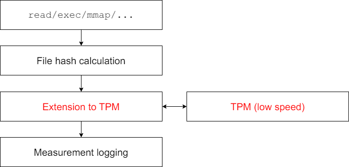 In IMA measurement mode, each measurement requires accessing the TPM. Since the TPM operates at low speeds, typically using the Serial Peripheral Interface (SPI) protocol with clock frequencies in the tens of MHz, system call performance suffers.