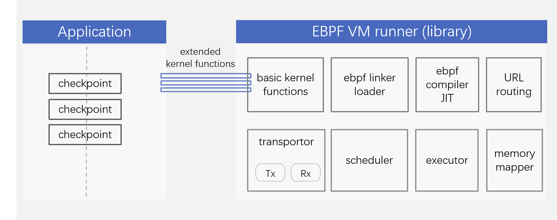 Extended kernel functions: custom library functions provided by each hook point in addition to the core functions provided by the eBPF VM runner.
