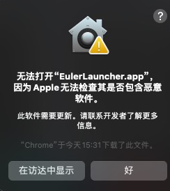 EulerLauncher supports macOS Ventura for Apple Silicon and x86 architectures. Download the latest version of EulerLauncher for macOS and decompress it to the desired location.
