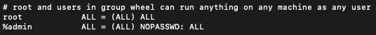 %admin ALL=(ALL) ALLwith%admin ALL=(ALL) NOPASSWD: ALL.Press ESC and enter :wq to save the settings.