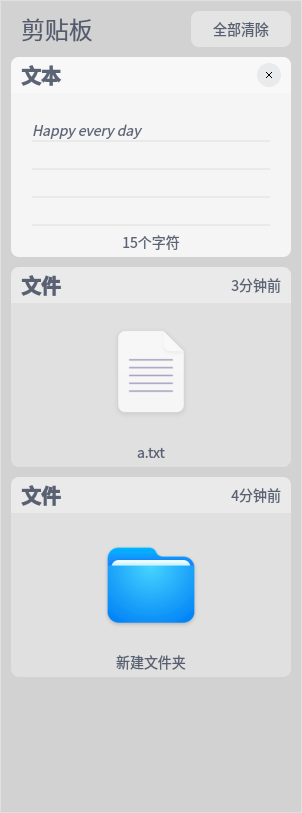 All the texts, pictures and documents cut and copied by the current user after login are displayed in the clipboard, which can be copied quickly by double-clicking the clipboard. The clipboard is cleared automatically after logout and shutdown.