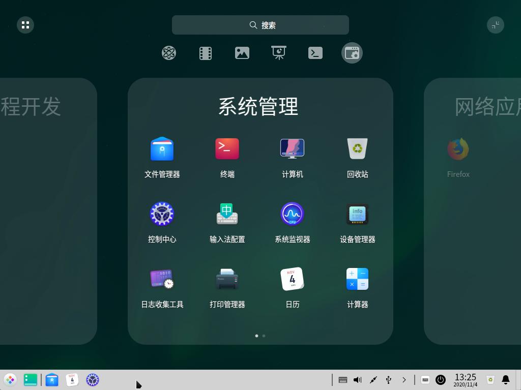 Dock is at the bottom of the desktop by default to help you quickly open frequently-used applications, which includes Launcher, applications, system tray, and plugins. In the dock, you can open launcher, show the desktop, enter the workspaces, open and exit apps, set input methods, adjust the volume, connect to the network, view the calendar and enter the shutdown interface, and so on.