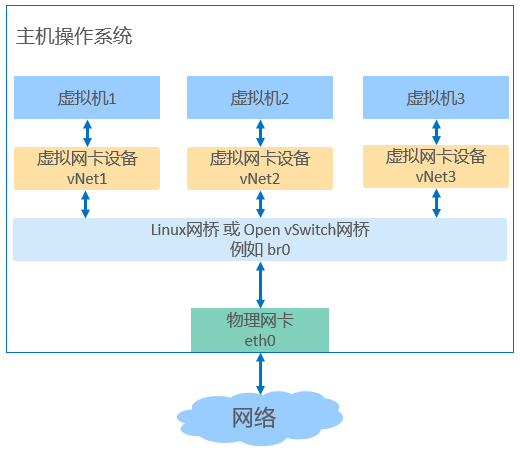 To enable the VM to communicate with external networks, you need to configure the network environment for the VM. KVM virtualization supports multiple types of bridges, such as Linux bridge and Open vSwitch bridge. As shown in Figure 1, the data transmission path is VM > virtual NIC device > Linux bridge or Open vSwitch bridge > physical NIC. In addition to configuring virtual NICs (vNICs) for VMs, creating a bridge for a host is the key to connecting to a virtualized network.