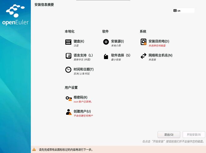 部分配置项会有告警符号,用户完成该选项配置后,告警符号消失。当界面上不存在告警符号时,用户才能单击“开始安装”进行系统安装。