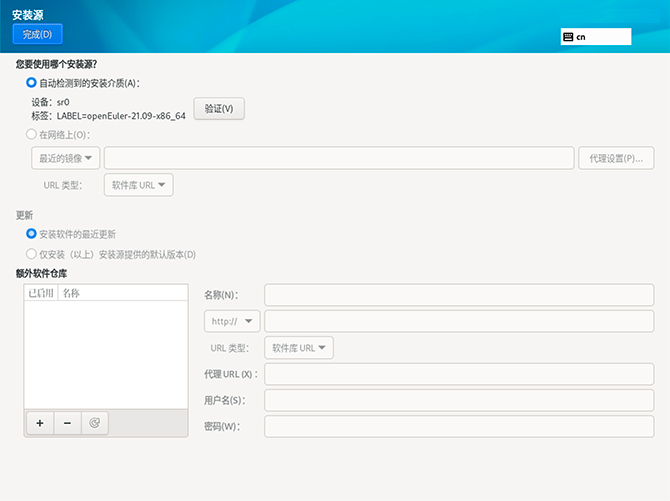 输入框内容以实际版本发布的安装源地址为准,如 https://repo.openeuler.org/openEuler-20.03-LTS-SP4/ISO/x86_64/ ,其中 openEuler-20.03-LTS-SP4 为版本号,x86_64 为CPU 架构,可根据实际情况输入。