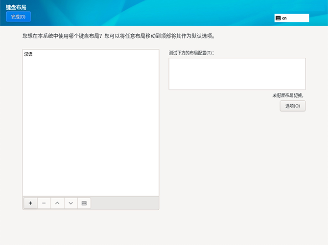 在“安装信息摘要”页面中选择“键盘”,用户可以在系统中添加或者删除多个键盘布局。