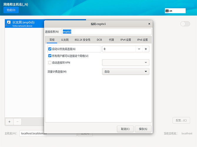 安装程序会自动探测可本地访问的接口。探测到的接口列在左侧方框中,右侧显示相应的接口详情,如图15所示。用户可以通过页面右上角的开关,来开启或者关闭网络接口。开关默认是关闭状态,若设置安装源选择的是在网络上安装,需要开启开关。用户还可以单击“配置”以配置选中的接口。勾选“自动以优先级连接”选项,即可将该网卡设置为开机自启动,如图16所示。