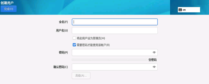 在“安装信息摘要”页面中选择“创建用户”,弹出“创建用户”的界面如图18所示。输入用户名,并设置密码。另外您还可以通过“高级”选项设置用户主目录、用户组等,如图19所示。