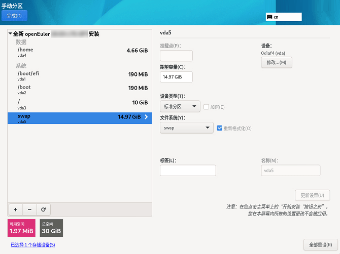 若用户需进行手动分区,选择“自定义”按钮,并单击左上角“完成”,出现手动分区界面。