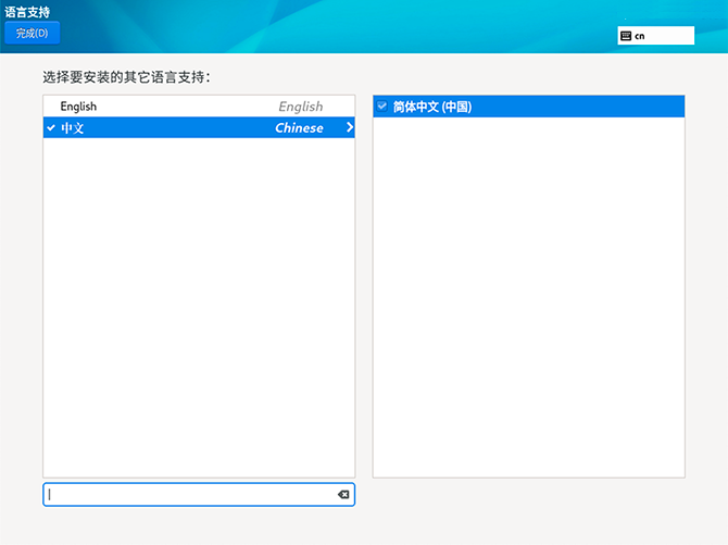 在“安装信息摘要”页面中选择“语言支持”,设置系统的语言。如图8所示,用户也可根据实际情况进行调整,选择“中文”。