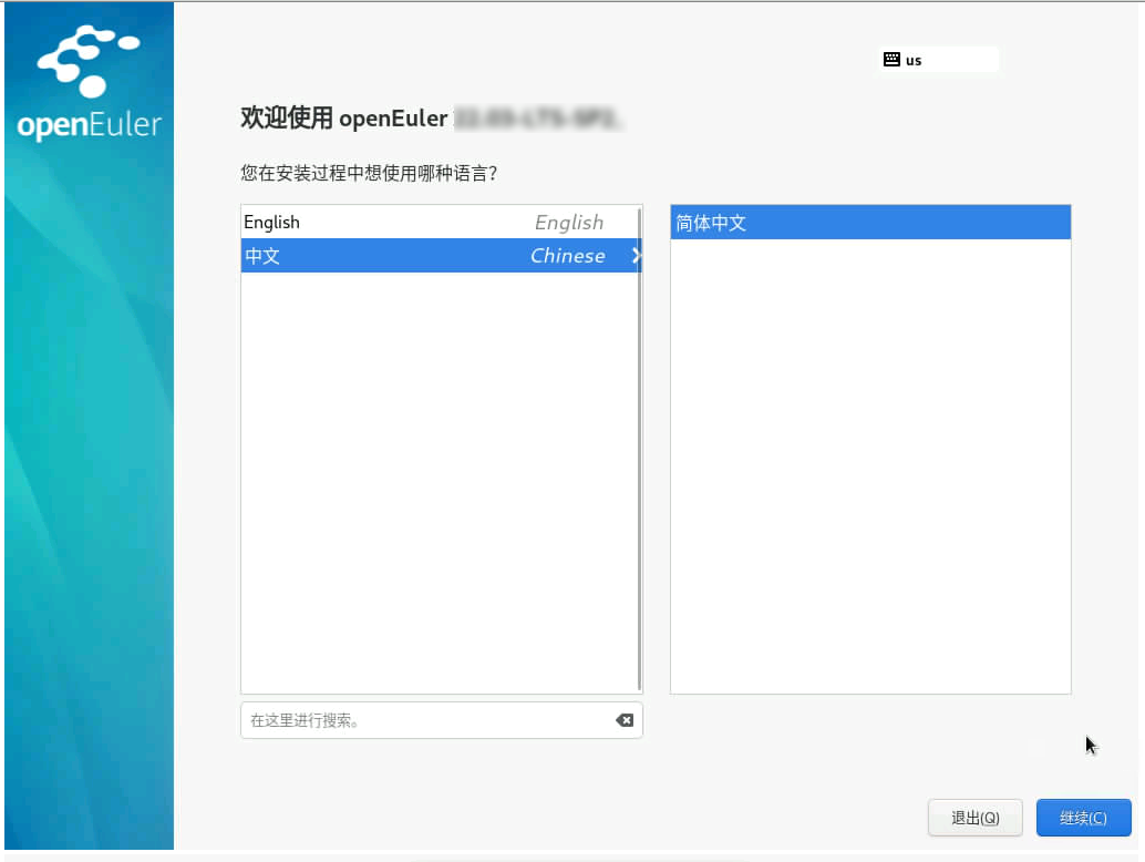 说明: 若选择“中文”,系统安装完成后,可以选择使用VNC登录【不支持中文显示】、串口登录【支持中文显示】、SSH登录【支持中文显示与使用的SSH客户端有关】。若选择“English”,则无影响。
