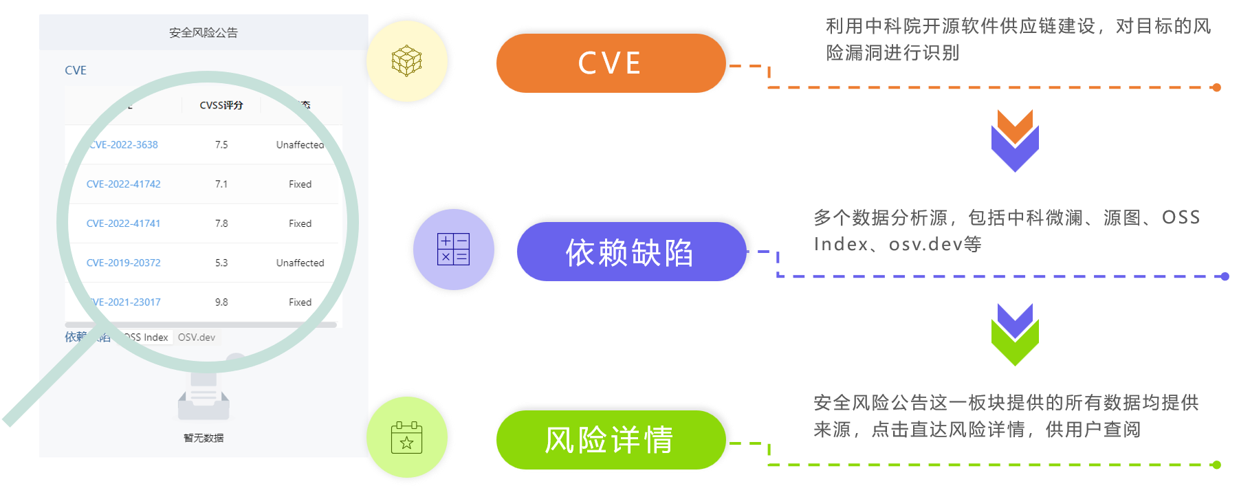 - 安全风险分析:利用中科院的开源软件供应链平台,oepkgs 镜像源对软件包进行深入的安全分析,可识别出软件包中的潜在安全风险和漏洞。