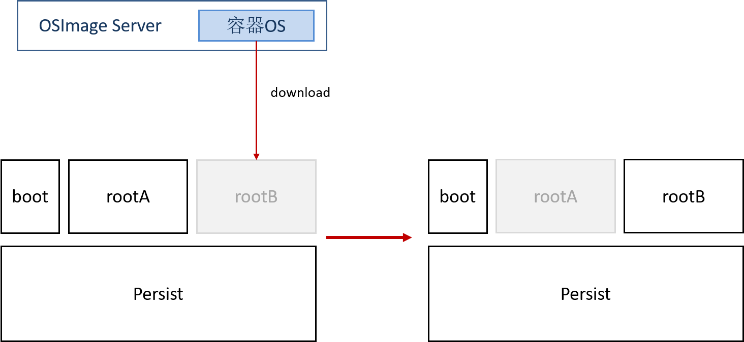 - 两个 root 分区:容器 OS 采用双分区模式,将 root 分区划分为 rootA 和 rootB。假定初始化时,系统运行在 rootA 分区上,当进行系统更新时,会下载新系统到 rootB 分区,grub会有两个启动项分别为A,B,将 grub 默认启动项设置为B,最后会重启虚拟机。虚拟机启动后容器 OS 将运行在刚更新过的 rootB 分区上。