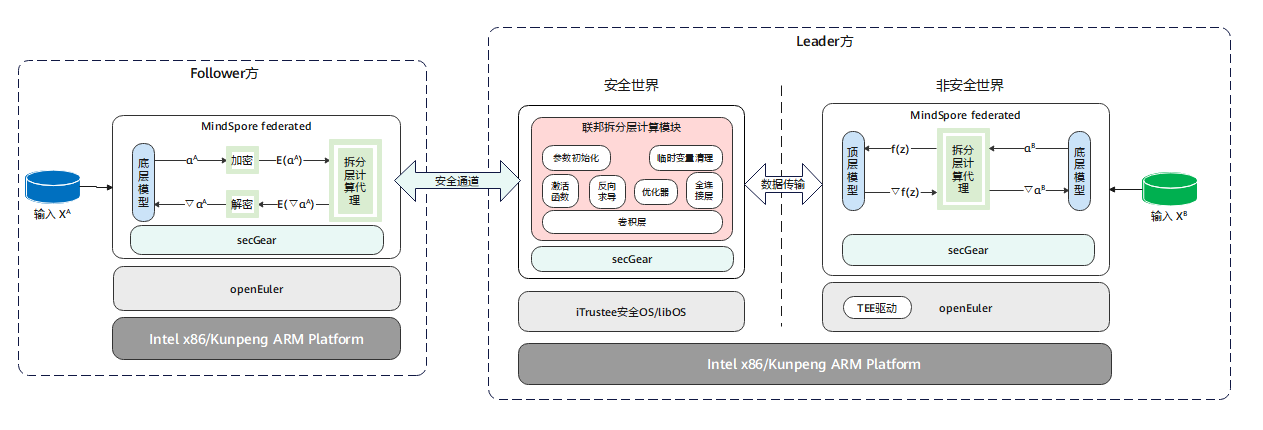 - Follower方的中间结果通过secGear的安全通道加密后传输到Leader方,Leader方非安全世界接收到加密的中间结果后中转到安全世界,在安全世界通过安全通道接口解密。