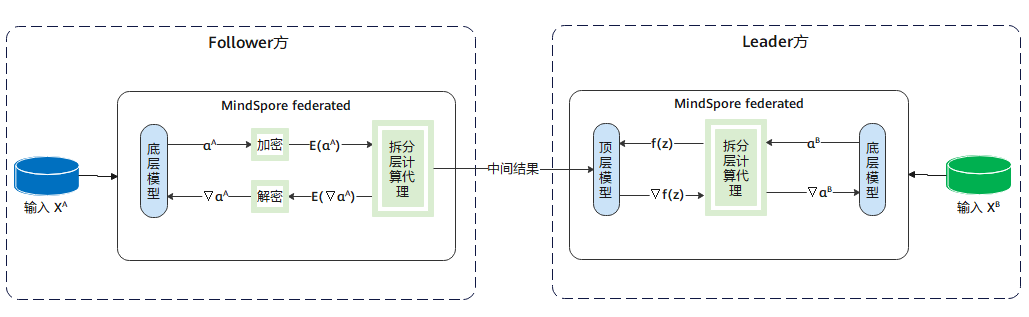 - 拥有属性的参与方(Follower方)都会持有一个底层网络,参与方属性输入底层网络得到中间结果,再将中间结果发送给拥有标签的参与方(Leader方)。