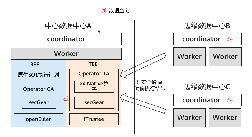 - 边缘数据中心通过secGear安全通道将本地计算结果加密后经网络传到数据中心A的REE侧,并中转到TEE中,在TEE中解密计算结果。
