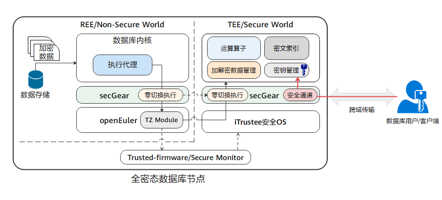 基于TEE的全密态数据库解决方案如图所示,全密态数据库的特点如下:
