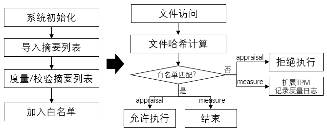 在度量模式下,导入内核的摘要列表文件需要进行度量和TPM扩展才可添加至白名单池,后续如果度量的目标文件的摘要值和白名单池匹配,则不进行额外的度量日志记录以及TPM扩展;在评估模式下,导入内核的摘要列表文件需要通过签名验证才可添加至白名单池,后续将访问的目标文件的摘要值和白名单池中的摘要值进行匹配即可判断评估结果。