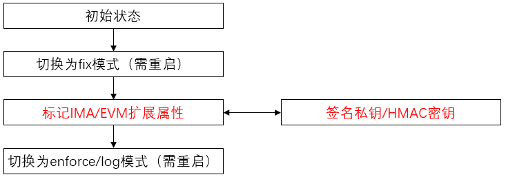 IMA评估模式下,需要通过fix模式进行部署,即系统首先需要进入fix模式进行IMA/EVM扩展属性标记,然后再切换为校验模式启动。同时在受保护的文件升级时,需要重启进入fix模式,完成文件和扩展属性更新。一方面降低了部署效率,另一方面需要在运行环境中访问密钥,降低了安全性: