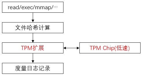 IMA度量模式下,每次触发度量都需要访问TPM芯片,TPM属于低速芯片,通常采用几十MHz时钟频率的SPI协议与CPU通信,导致系统调用性能下降: