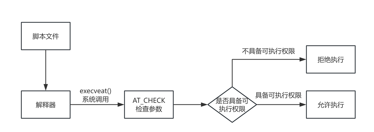 在支持基于execveat()的AT_CHECK检查机制的基础上,当解释器打开待运行的脚本后,可主动调用execveat()系统调用函数发起对文件进行可执行权限检查,只有当权限检查成功后,才可继续运行脚本文件。