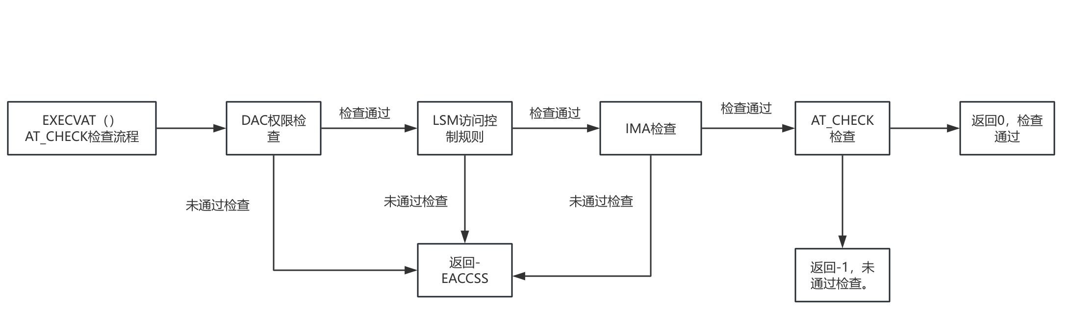 当调用者通过execveat()系统调用函数,传入目标文件描述符并指定AT_CHECK参数时,在内核的系统调用执行逻辑中,首先针对传入的文件描述符进行权限检查,该流程与普通的文件执行流程一致,包含文件的DAC权限位、LSM访问控制规则、IMA等检查,如果检查不通过则退出并返回错误码-EACCSS。直到所有权限检查流程完成后,execveat()系统调用判断参数是否包含AT_CHECK,如果包含,则不执行后续的执行流程,退出并返回0,表示该文件的可执行权限检查通过。