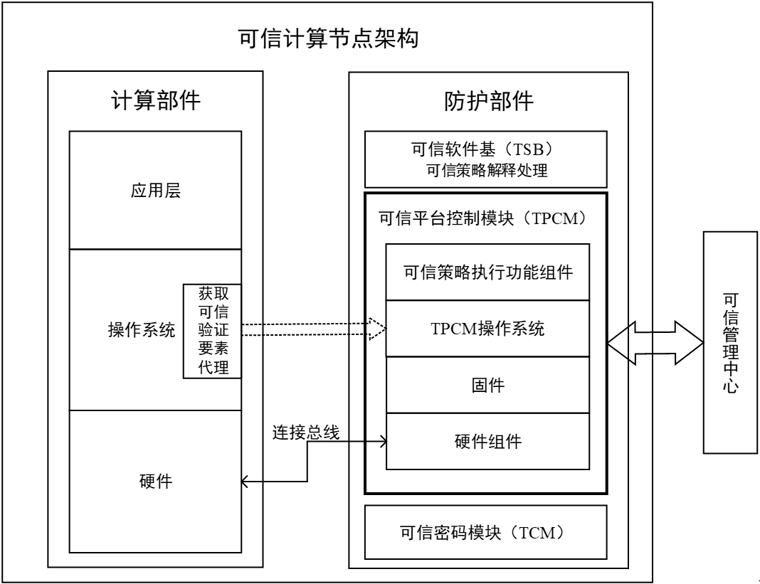 防护部件:独立于计算部件执行,为可信计算平台提供具有主动度量和主动控制特征的可信计算防护功能,实现运算的同时进行安全防护。防护部件包括可信平台控制模块、可信软件基,以及可信密码模块(Trusted Cryptography Module,TCM)。TPCM是可信计算节点中实现可信防护功能的关键部件,可以采用多种技术途径实现,如板卡、芯片、IP核等,其内部包含中央处理器、存储器等硬件,固件,以及操作系统与可信功能组件等软件,支撑其作为一个独立于计算部件的防护部件组件,并行于计算部件按内置防护策略工作,对计算部件的硬件、固件及软件等需防护的资源进行可信监控,是可信计算节点中的可信根。