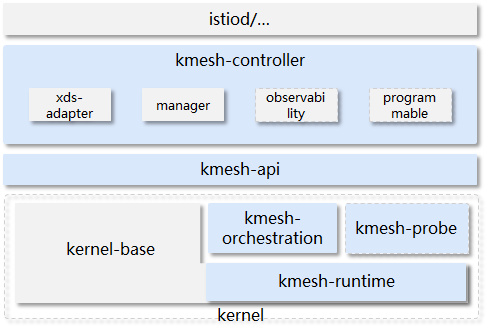 kmesh-controller: kmesh管理程序,负责Kmesh生命周期管理、XDS协议对接、观测运维等功能
