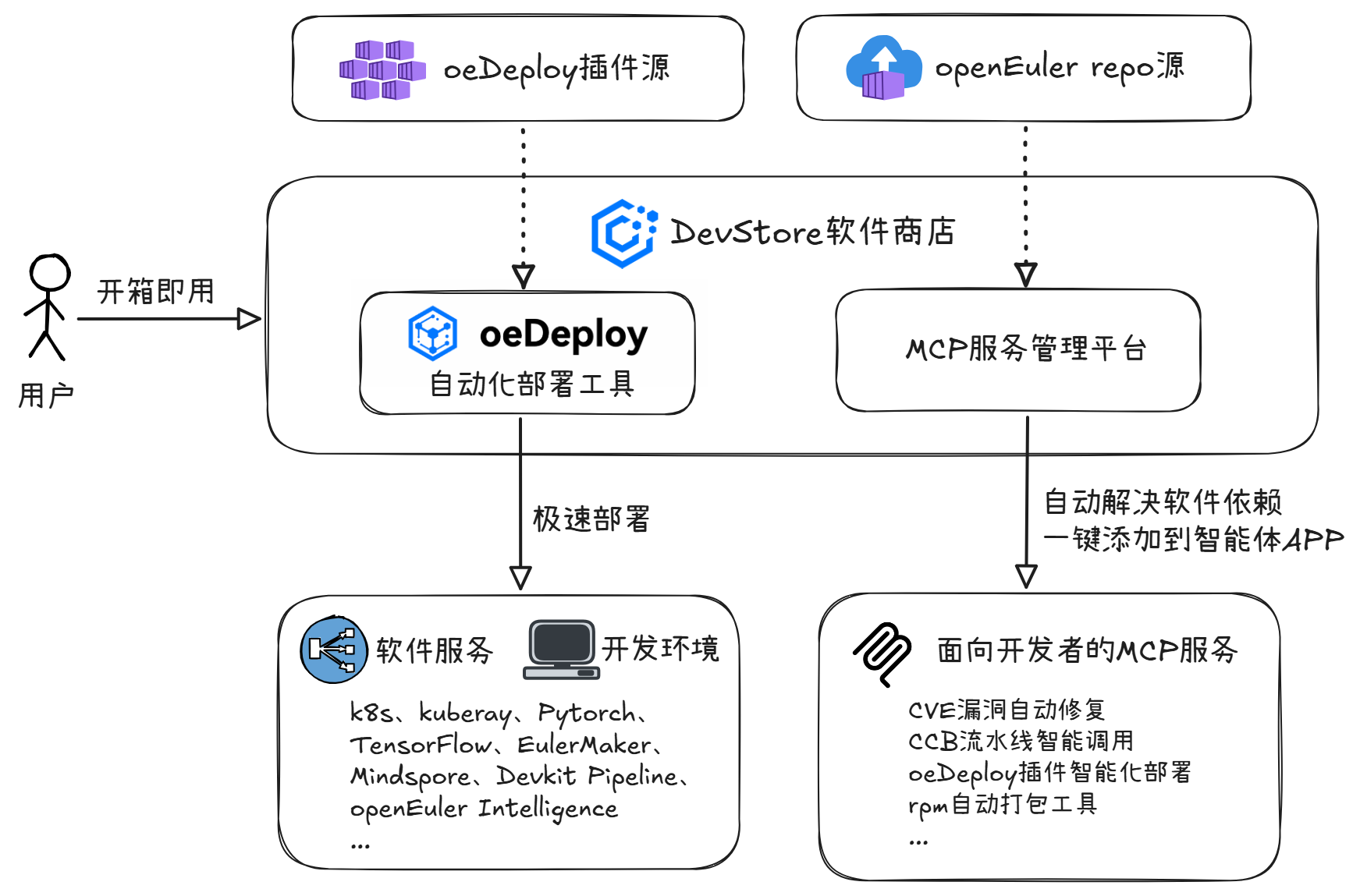 MCP服务一键安装:DevStore借助openEuler社区丰富的软件生态,以rpm软件包的形式处理MCP运行所需的软件依赖,并通过内置的服务管理工具,在智能体应用中快速部署MCP服务。自动帮助用户解决软件依赖与MCP配置问题,大幅提升用户体验。目前已支持80+MCP服务。 oeDeploy插件快速部署:DevStore借助oeDeploy工具实现主流软件的快速部署,大幅度降低开发者部署软件的时间成本。包括Kubernetes、Kuberay、Pytorch、TenserFlow、DeepSeek等AI软件,EulerMaker、openEuler Intelligence等社区工具链,以及RagFlow、Dify、AnythingLLM等主流的RAG工具。