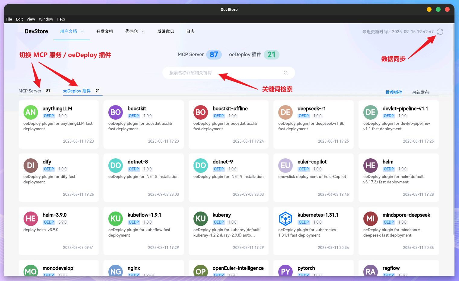 - DevStore 中的 MCP 服务来自 repo 源,oeDeploy 插件来自软件所的插件源,用户可以点击右上角的同步按钮更新数据。