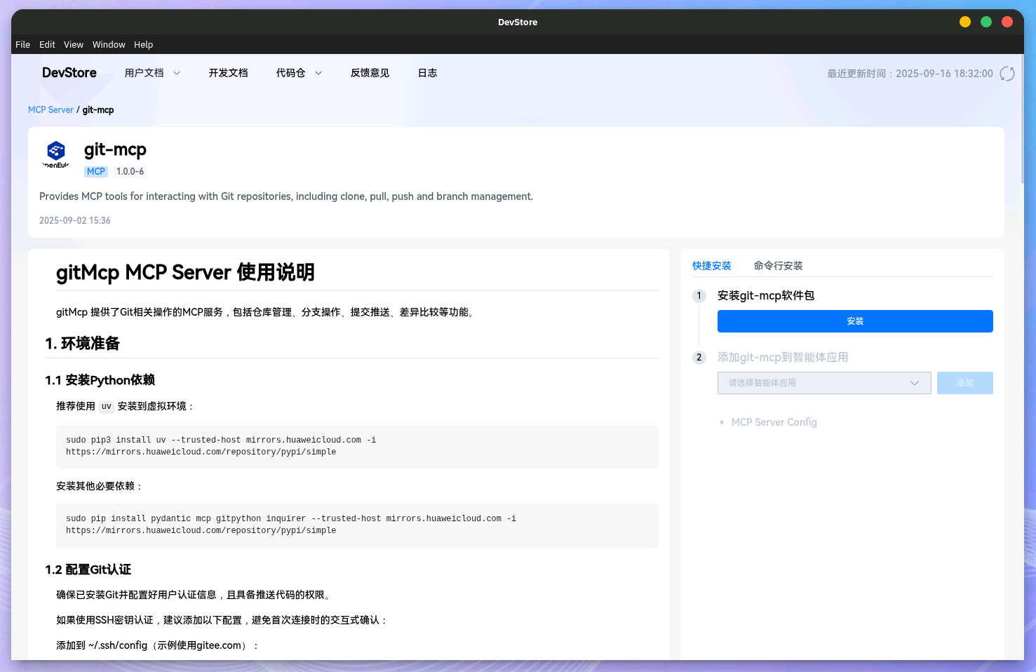 - DevStore 支持 MCP 服务和 oeDeploy 插件的快速部署,用户可以通过点击左侧的不同页签进行切换。