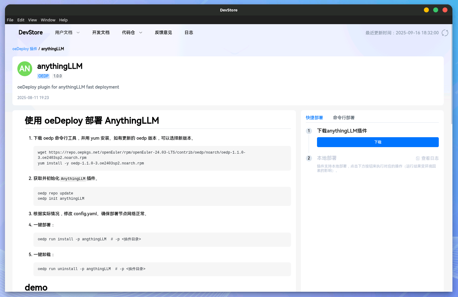 - 左侧为 oeDeploy 插件的用户文档,右侧为 oeDeploy 插件的快速部署控制台。