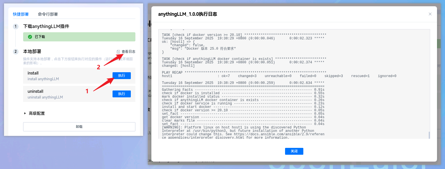- 触发任意部署操作后,点击查看日志,实时显示软件部署的执行日志。